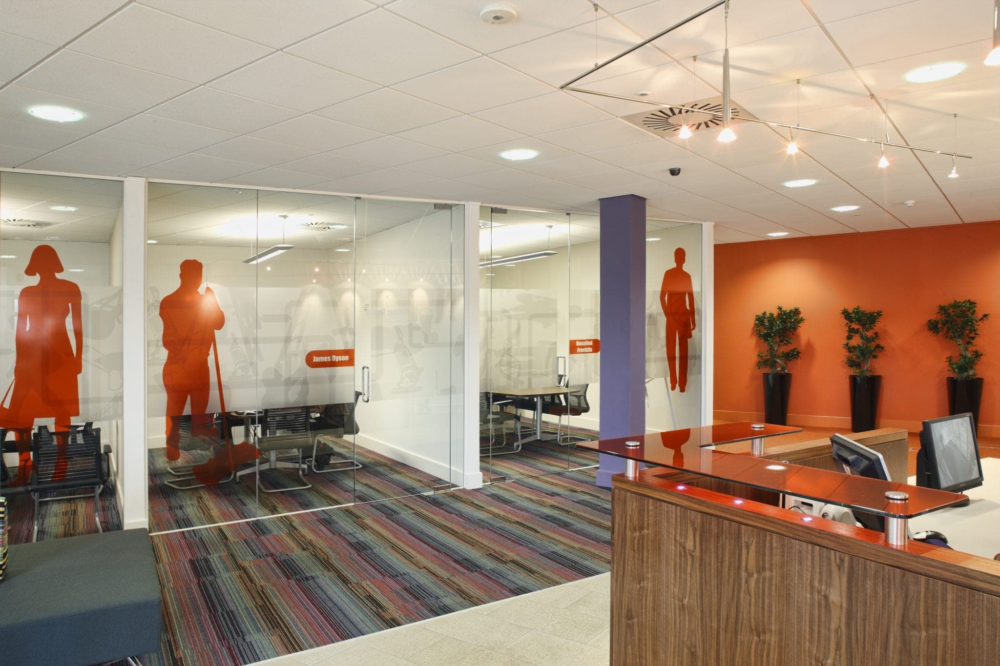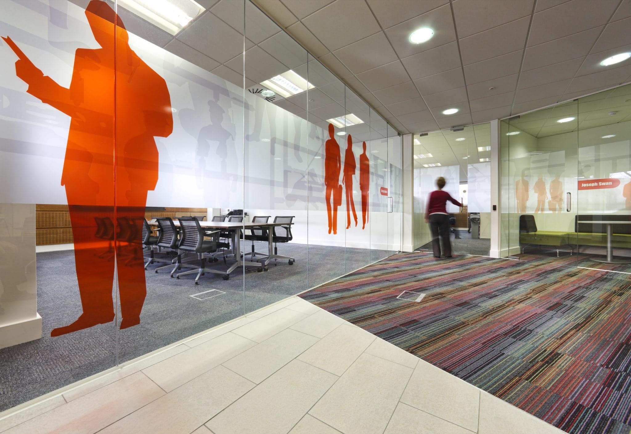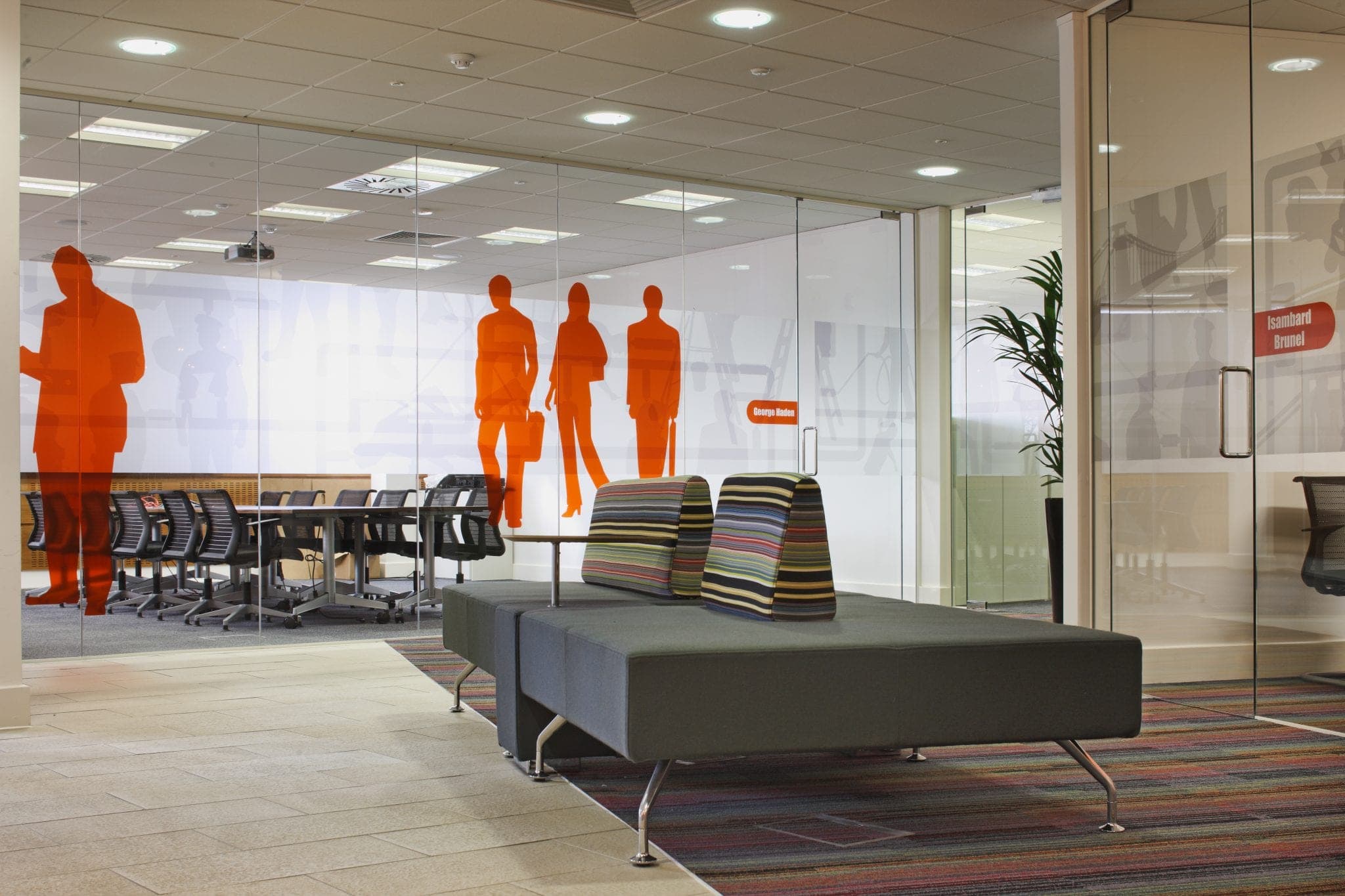 Office Design Bristol: The bright colours, make for a pleasant working environment, and they tie in with the shadow people, the accent walls, the furniture and swathes of colour cut out of the carpet to all come together in a coherent solution.